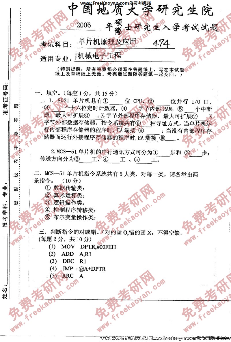 中国地质大学(武汉)2006年考研真题-单片机原理与应用