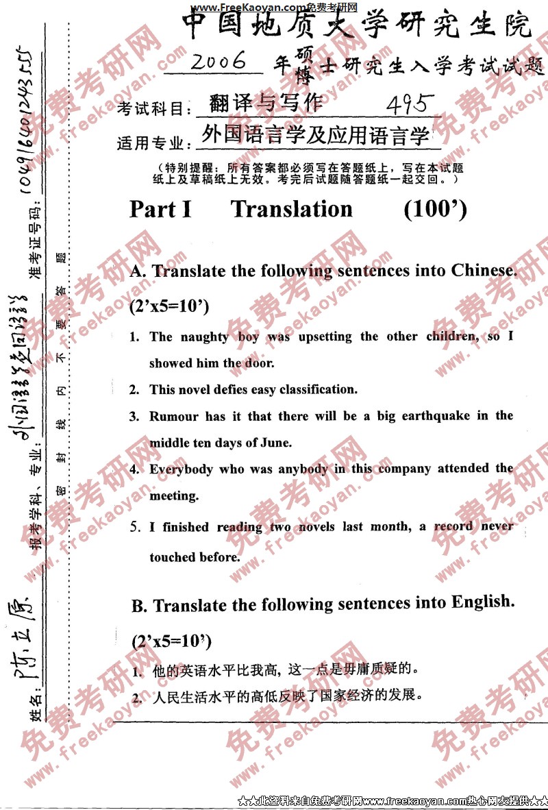 中国地质大学(武汉)2006年考研真题-翻译与写作