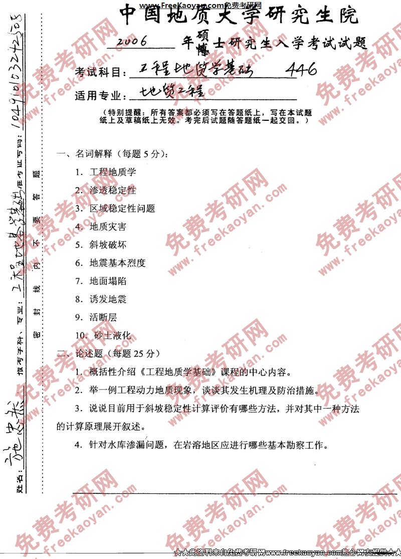 中国地质大学(武汉)2006年考研真题-工程地质学基础