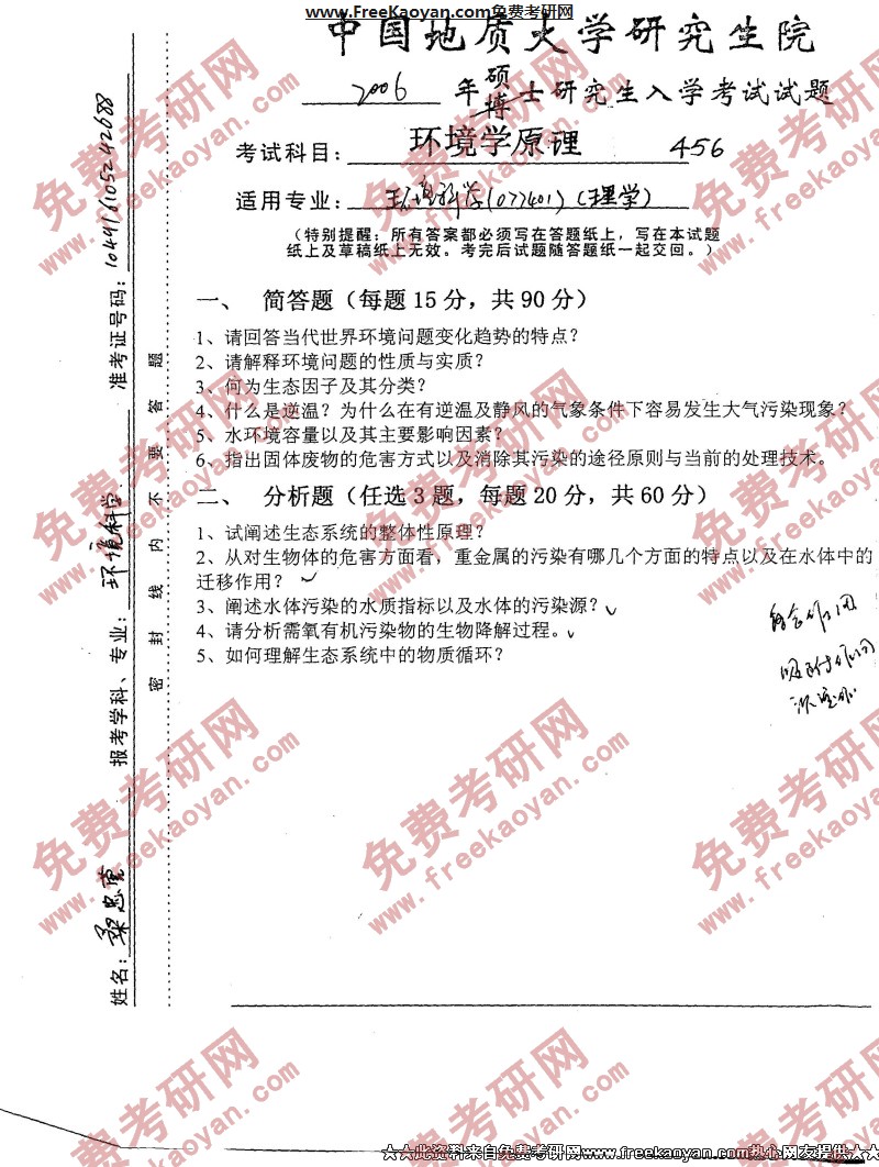 专业课考研经验 本站小编 FreeKaoyan 2018-01-23中国地质大学(武汉)2006年考研真题-环境地址学