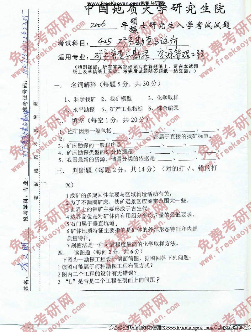 中国地质大学(武汉)2006年考研真题-矿产勘察与评价