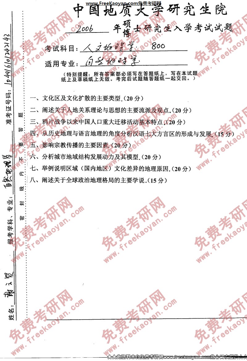 专业课考研经验 本站小编 FreeKaoyan 2018-01-23中国地质大学(武汉)2006年考研真题-环境地址学