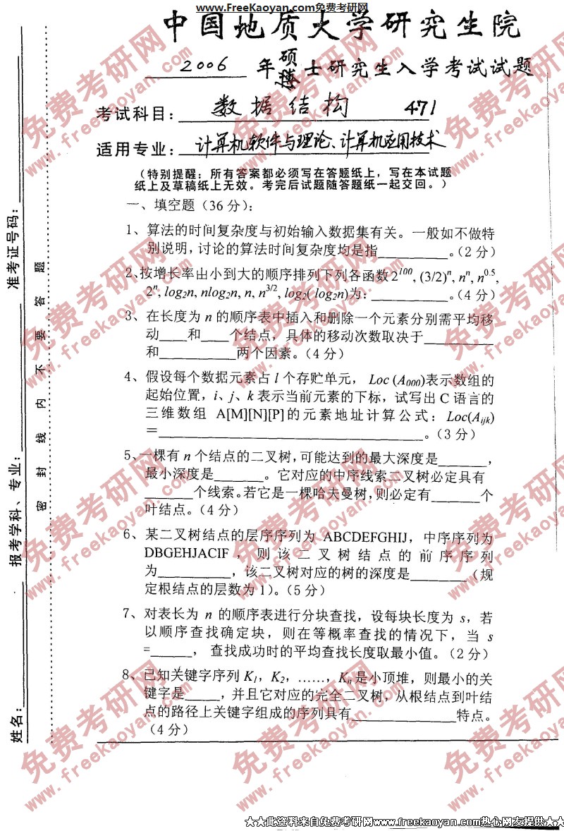 专业课考研经验 本站小编 FreeKaoyan 2018-01-23中国地质大学(武汉)2006年考研真题-矿产普查与勘探