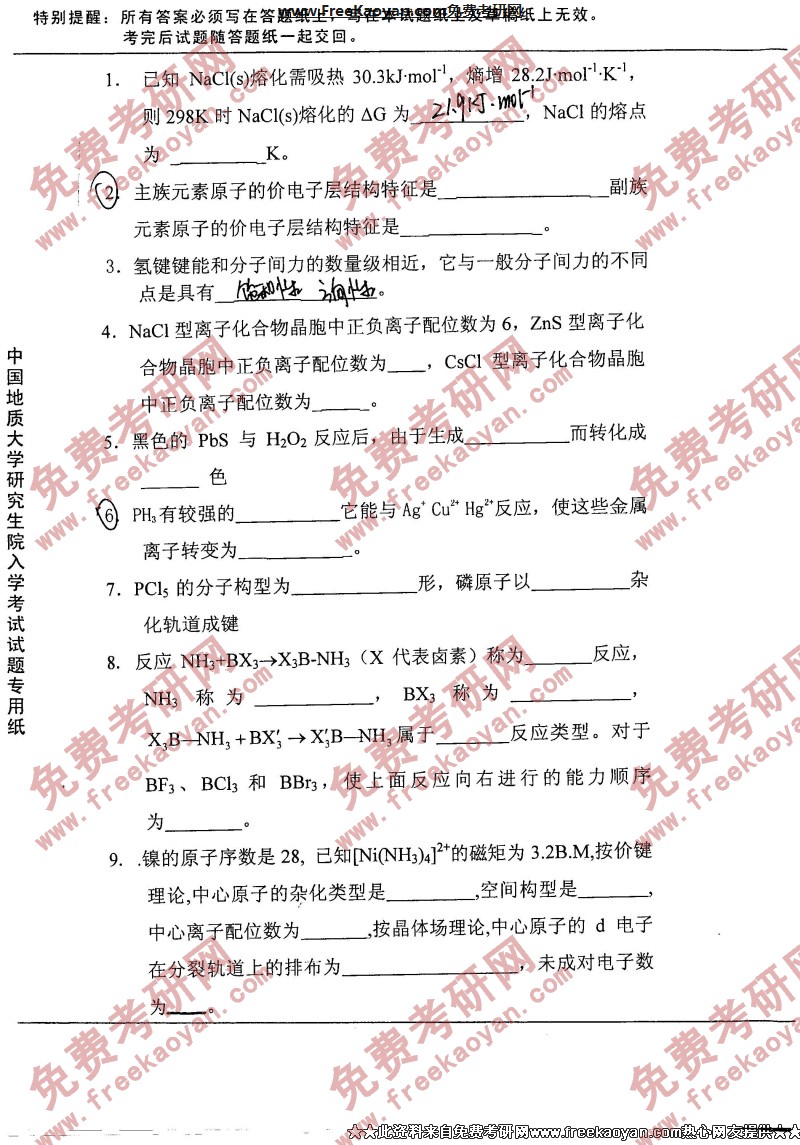 中国地质大学(武汉)2006年考研真题-无机化学(3)