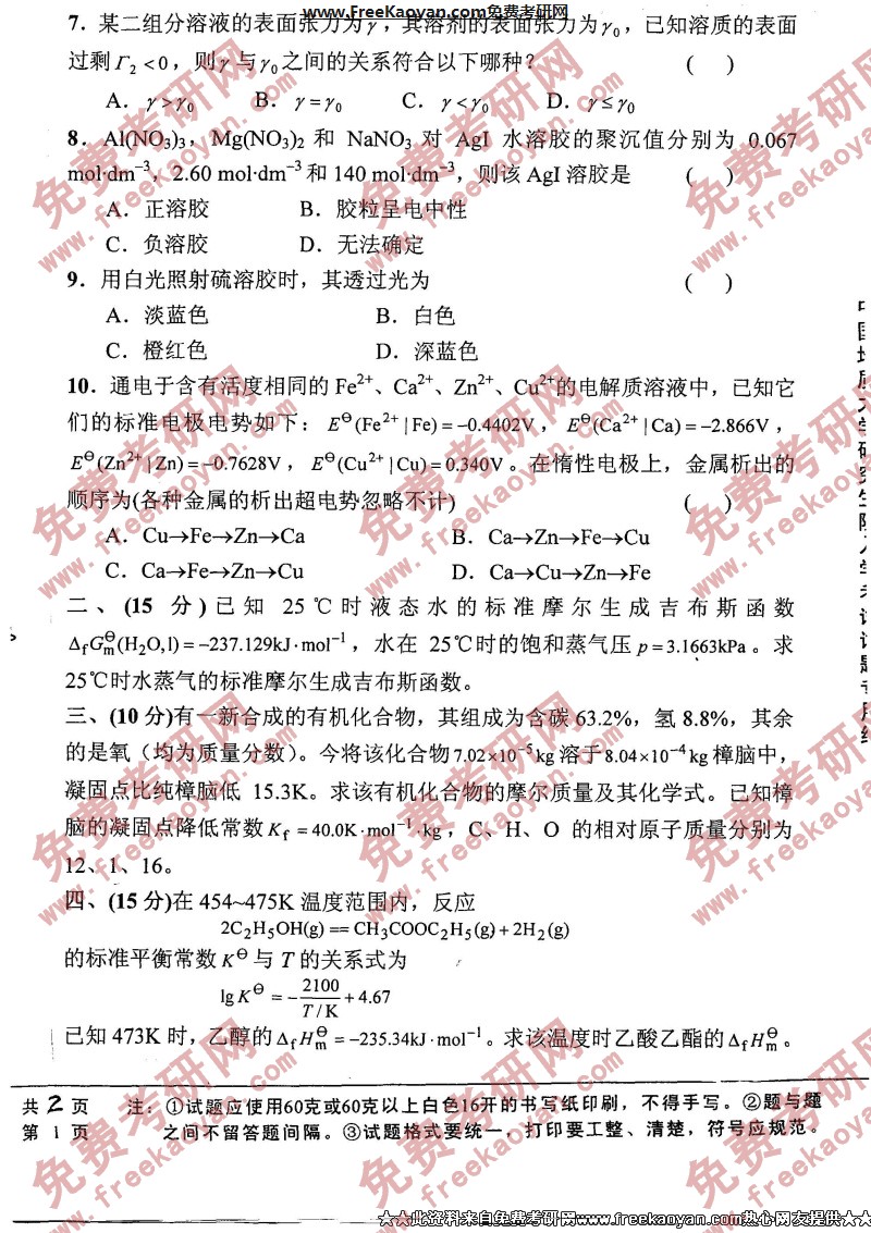 中国地质大学(武汉)2006年考研真题-物理化学(2)