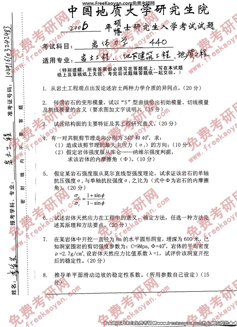 中国地质大学(武汉)2006年考研真题-岩体力学