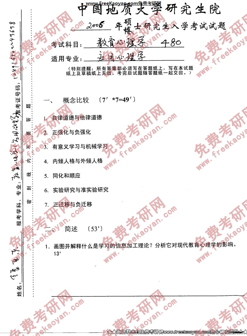 专业课考研经验 本站小编 FreeKaoyan 2018-01-23中国地质大学(武汉)2006年考研真题-心理学
