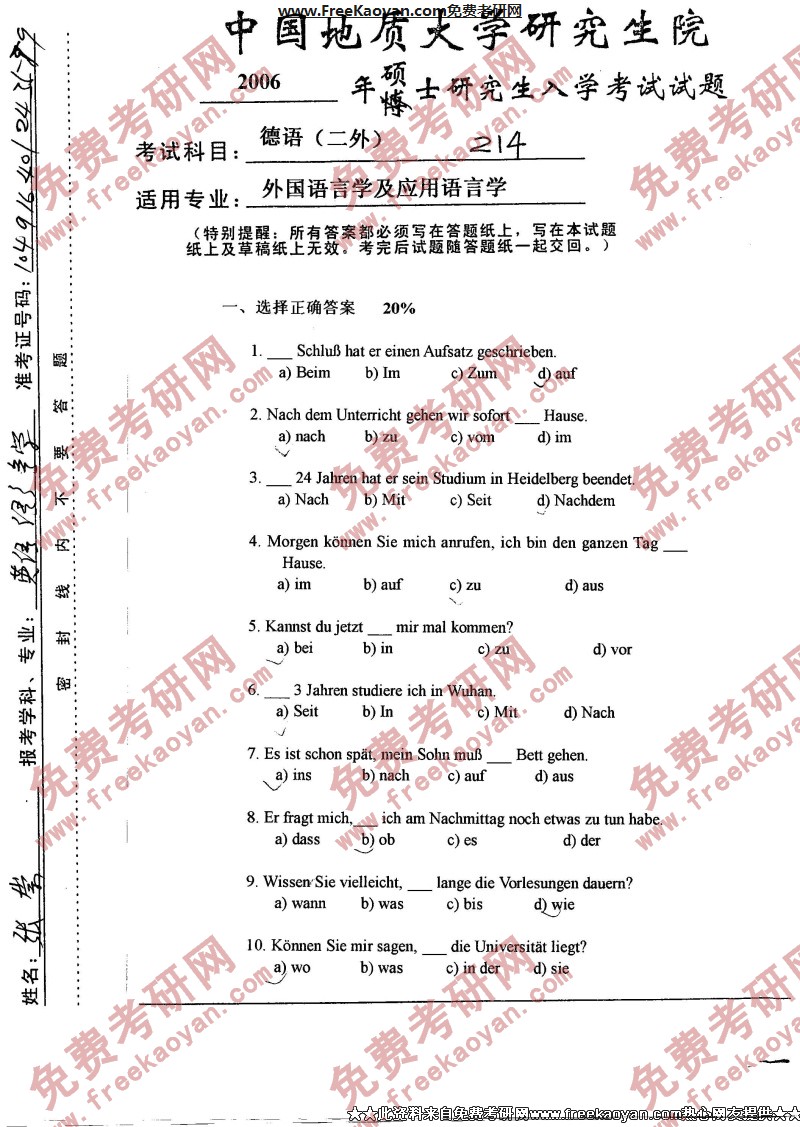 中国地质大学(武汉)2006年考研真题-德语(二外)