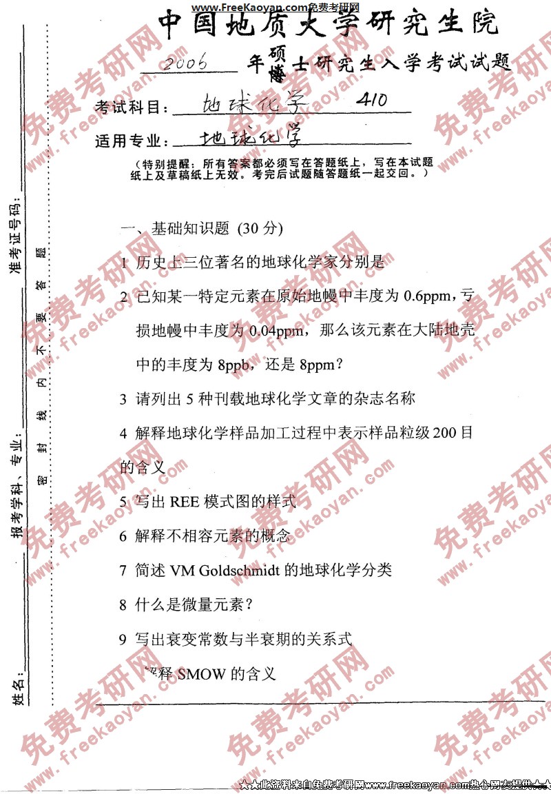 专业课考研经验 本站小编 FreeKaoyan 2018-01-23中国地质大学(武汉)2006年考研真题-无机化学