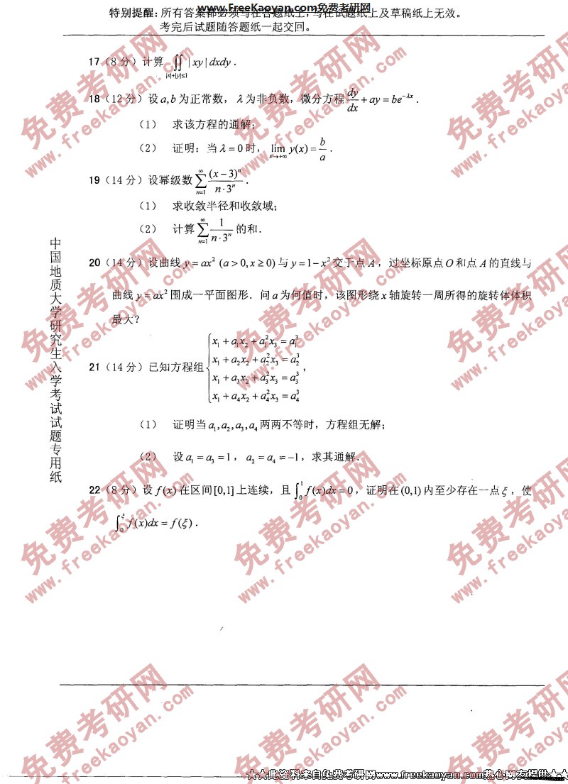 中国地质大学(武汉)2006年考研真题-高等数学(3)