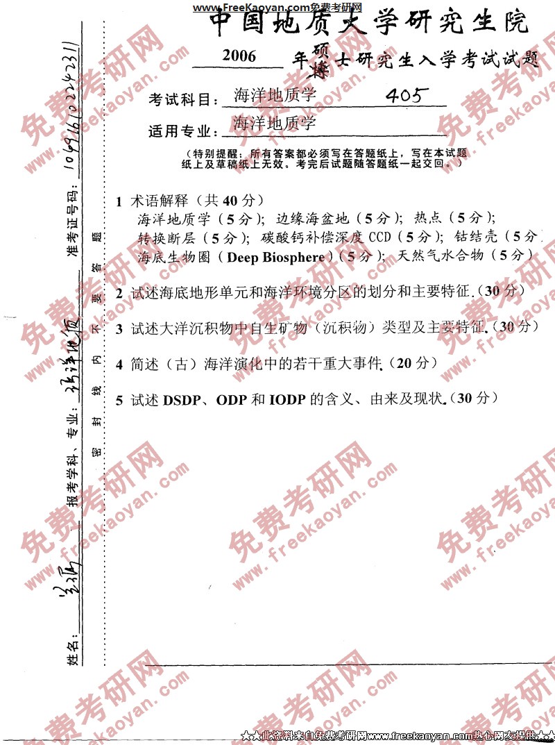 中国地质大学(武汉)2006年考研真题-海洋地质学