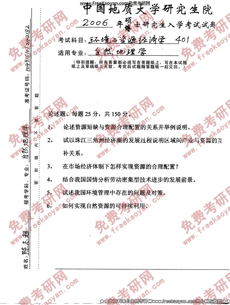 中国地质大学(武汉)2006年考研真题-环境与资源经济学