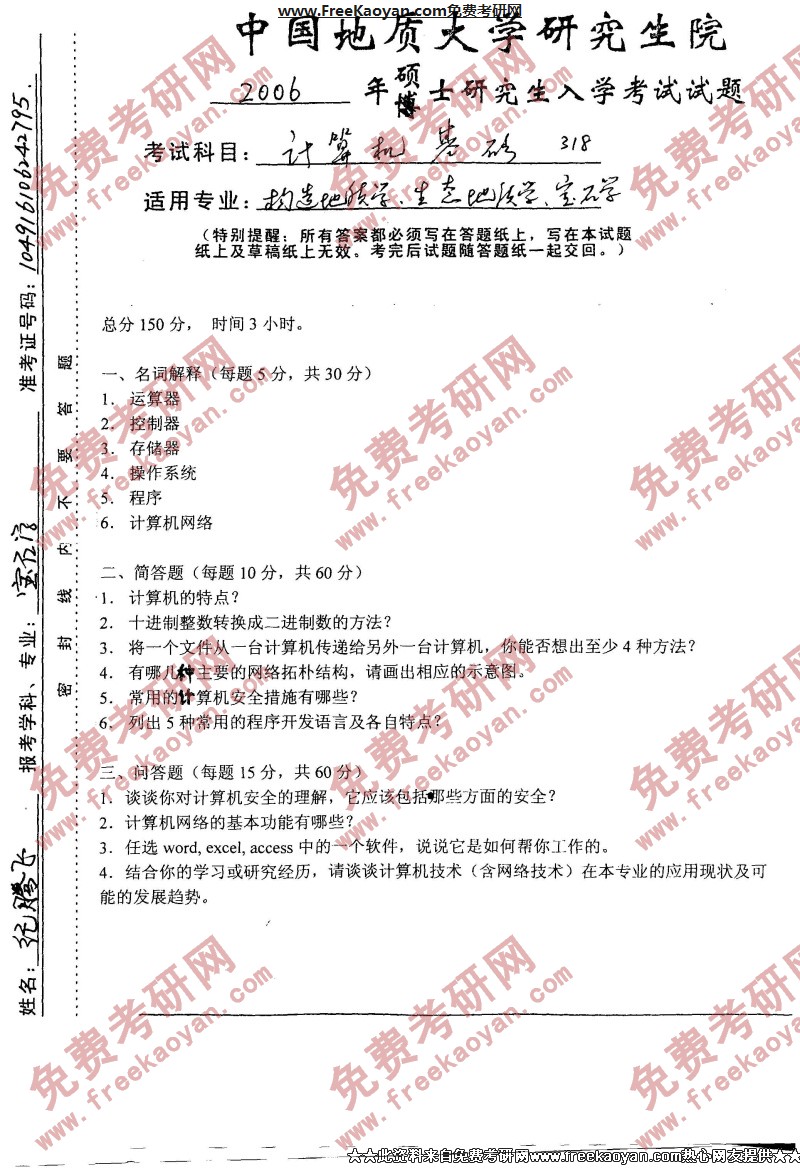 中国地质大学(武汉)2006年考研真题-计算机基础