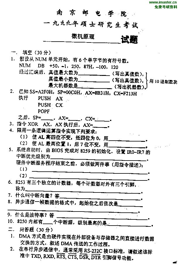 南京邮电大学1999年考研真题-微机原理