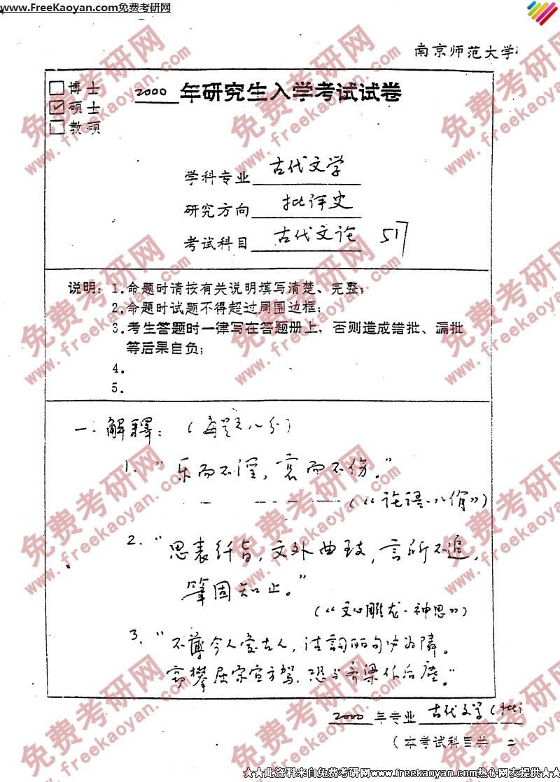 专业课考研经验 本站小编 FreeKaoyan 2018-01-23南京师范大学1999年考研真题-文学评论写作