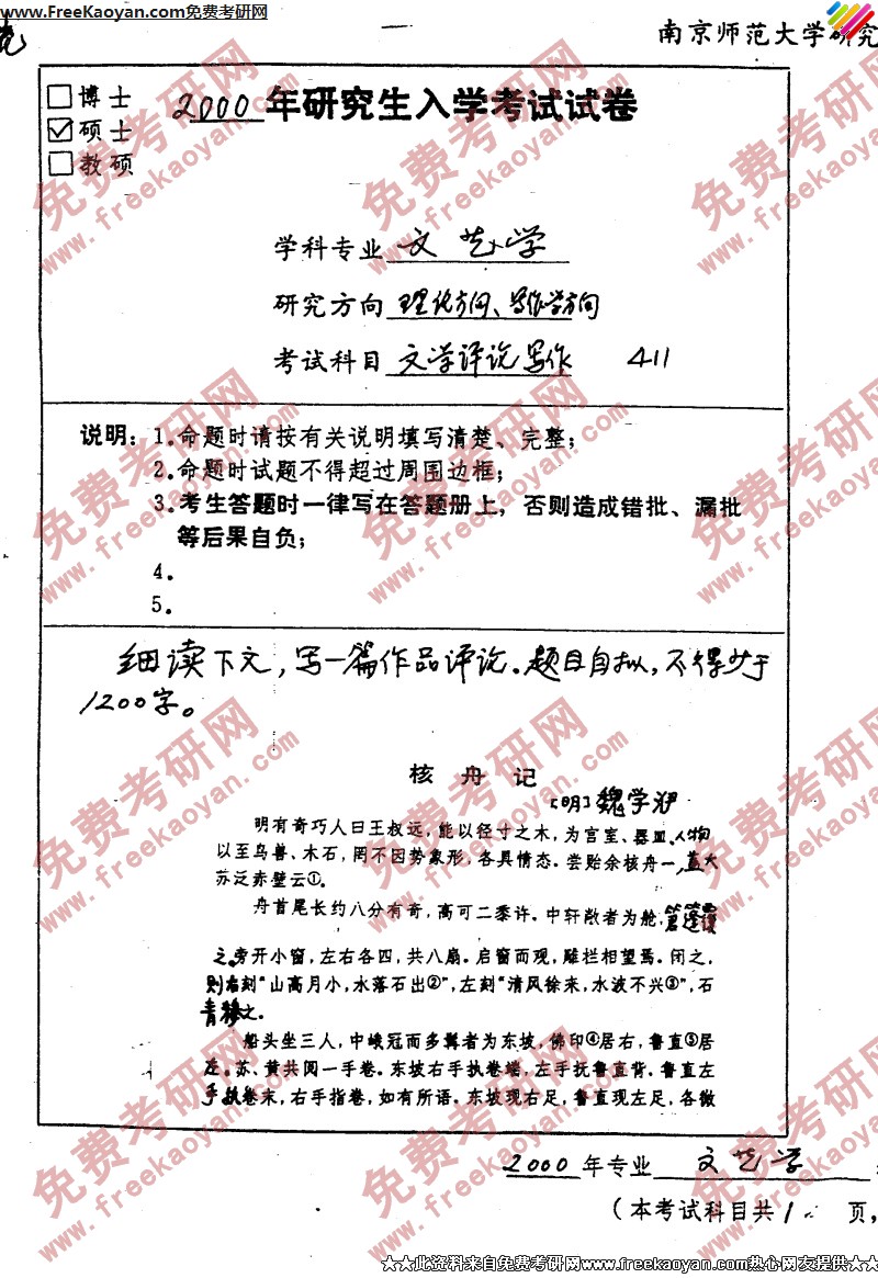 南京师范大学2000年考研真题-文学评论写作