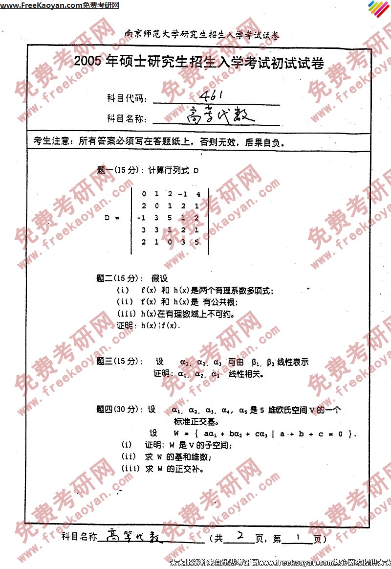 南京师范大学2005年考研真题-高等代数