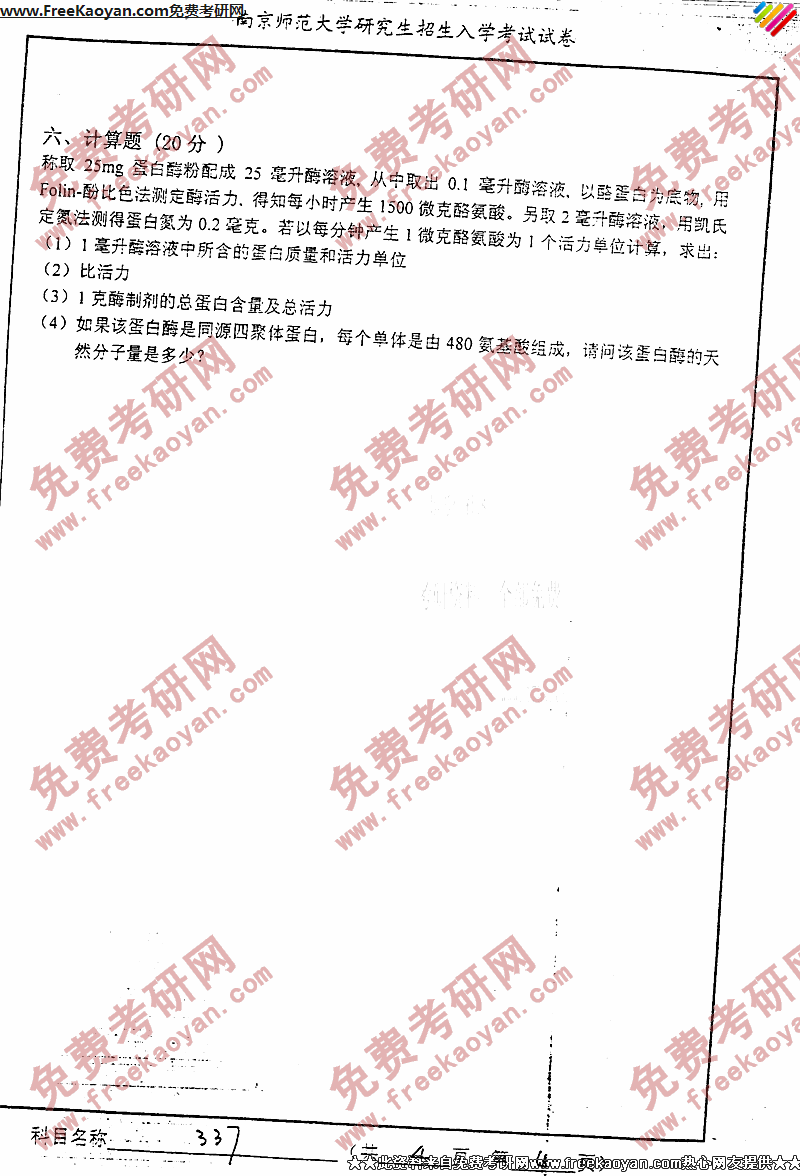 专业课考研经验 本站小编 FreeKaoyan 2018-01-23南京师范大学2004年考研真题-生物化学B卷
