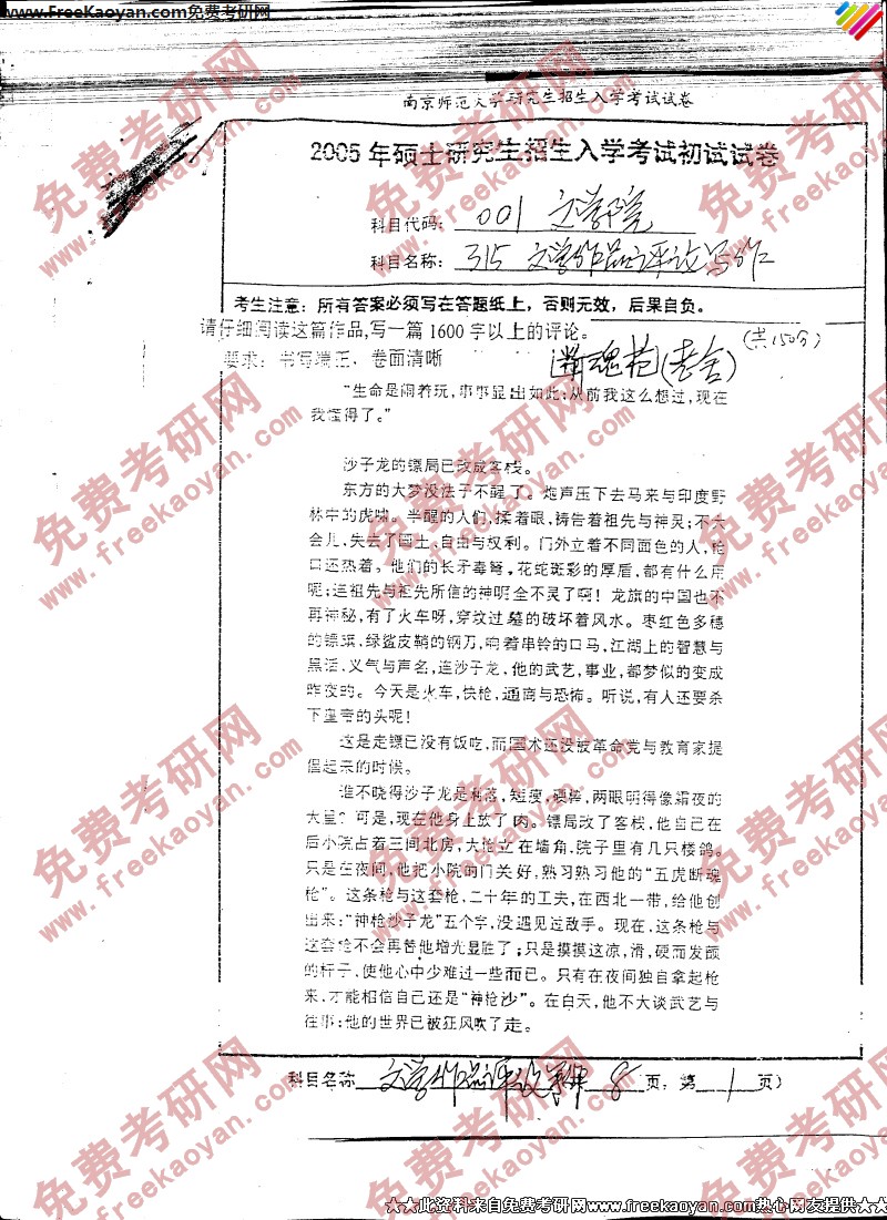 专业课考研经验 本站小编 FreeKaoyan 2018-01-23南京师范大学2003年考研真题-文学评论写作