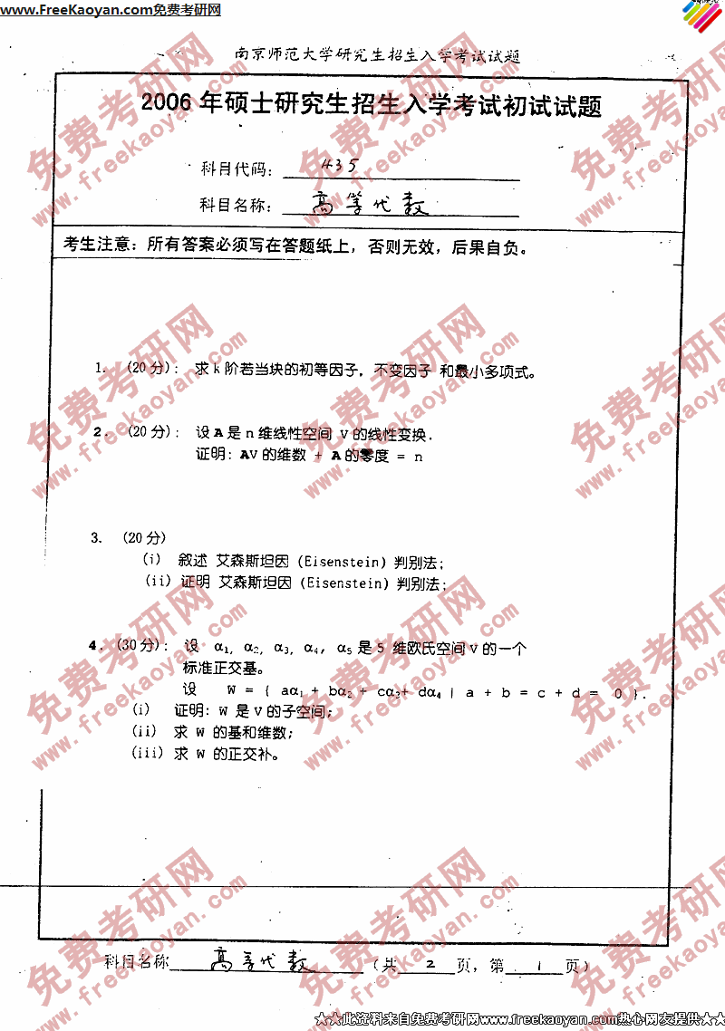 专业课考研经验 本站小编 FreeKaoyan 2018-01-23南京师范大学2005年考研真题-高等代数