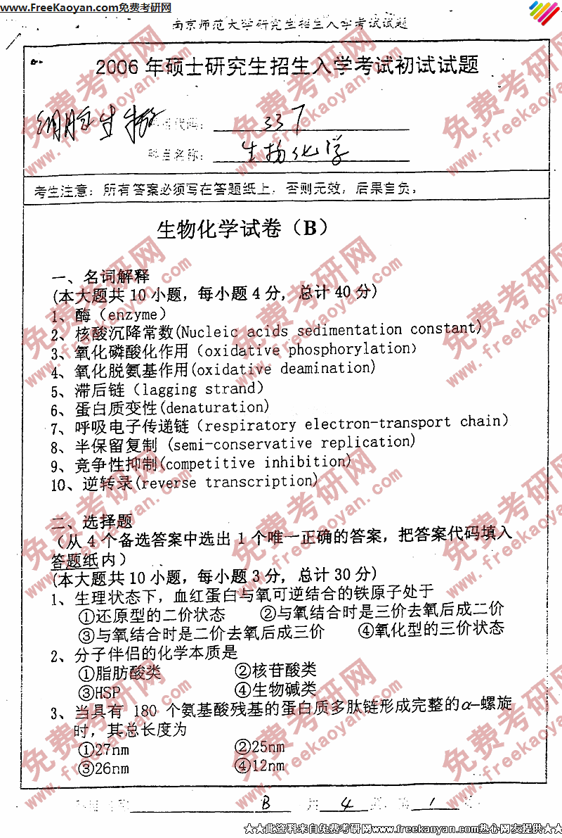 专业课考研经验 本站小编 FreeKaoyan 2018-01-23南京师范大学2004年考研真题-生物化学B卷