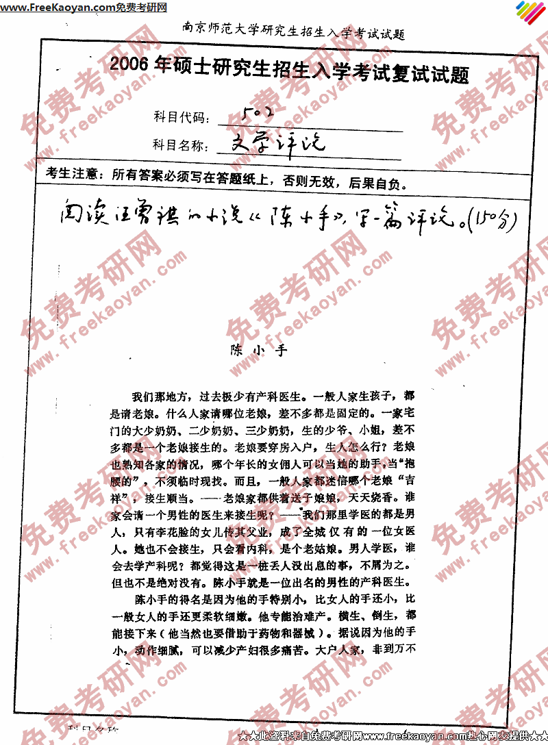 专业课考研经验 本站小编 FreeKaoyan 2018-01-23南京师范大学2005年考研真题-文学评论写作