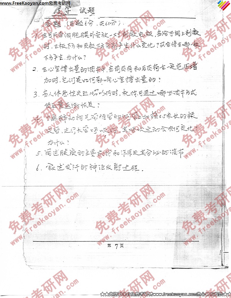 中国药科大学1991年考研真题-生理学(7)