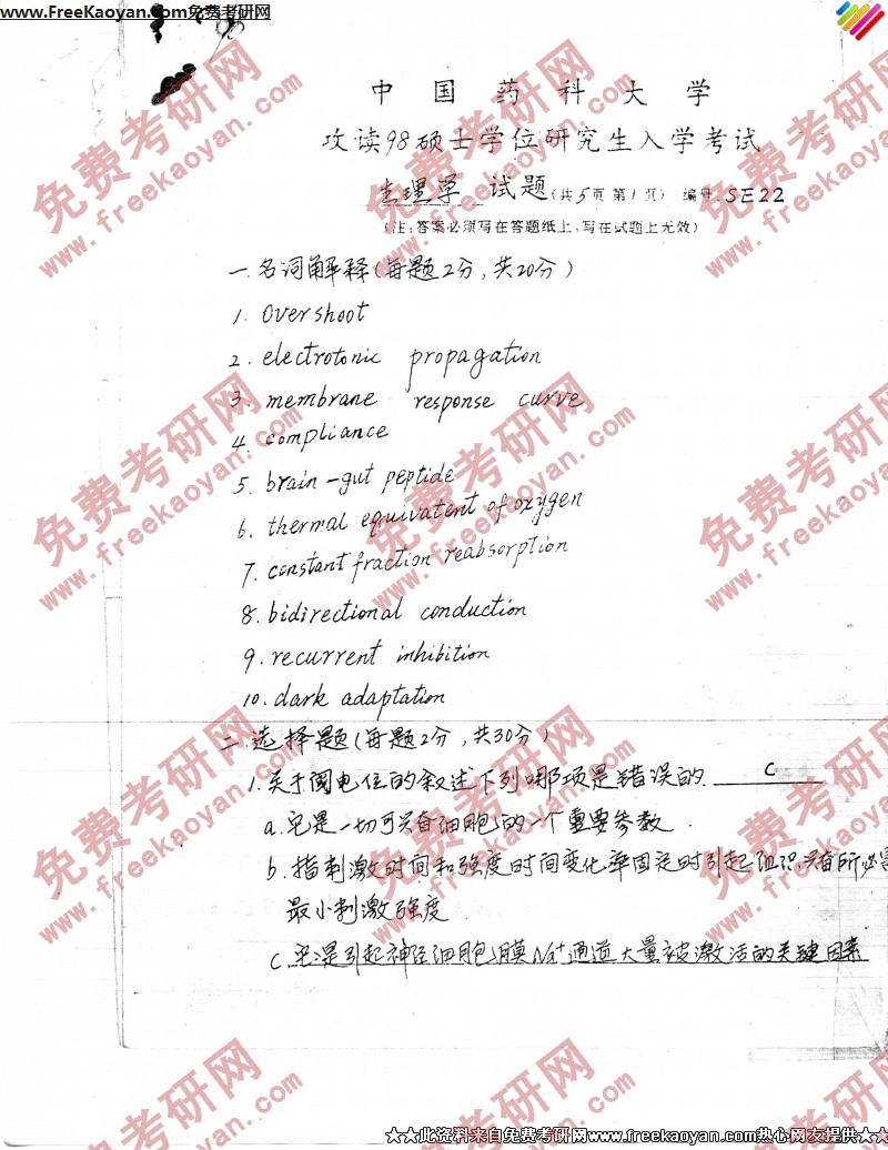 专业课考研经验 本站小编 FreeKaoyan 2018-01-23中国药科大学1991年考研真题-生理学