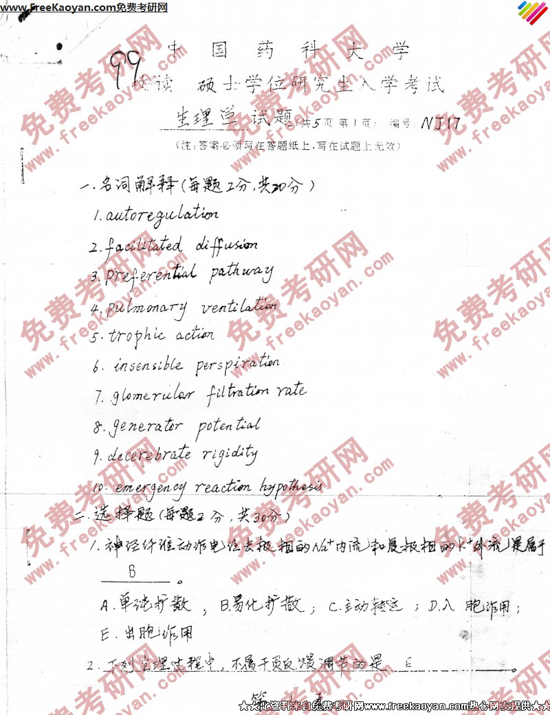 专业课考研经验 本站小编 FreeKaoyan 2018-01-23中国药科大学1991年考研真题-生理学