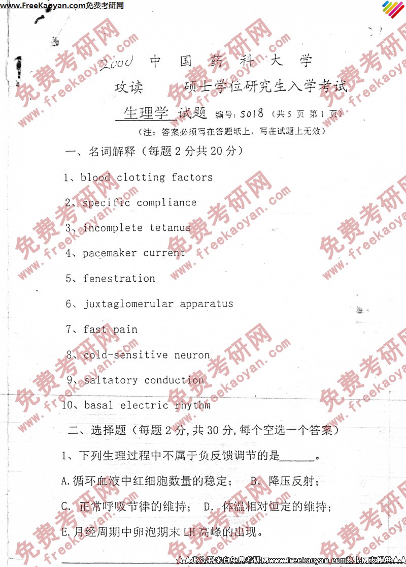 专业课考研经验 本站小编 FreeKaoyan 2018-01-23中国药科大学1992年考研真题-生理学