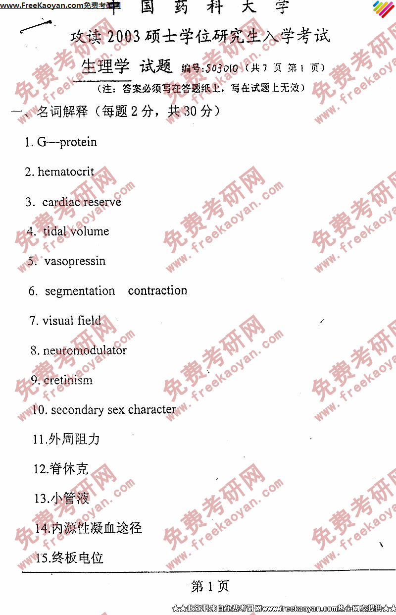 专业课考研经验 本站小编 FreeKaoyan 2018-01-23中国药科大学2002年考研真题-生理学