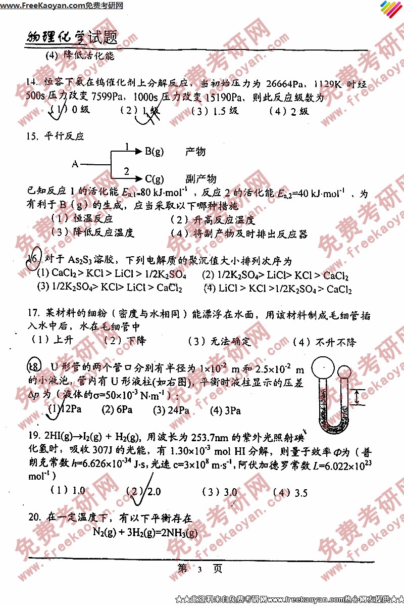 中国药科大学2003年考研真题-物理化学(3)