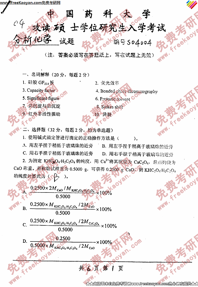 专业课考研经验 本站小编 FreeKaoyan 2018-01-23中国药科大学2003年考研真题-分析化学