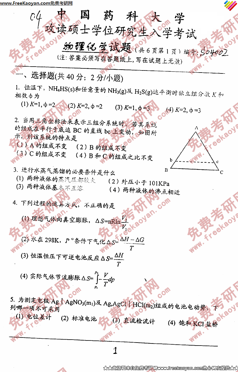 中国药科大学2004年考研真题-物理化学