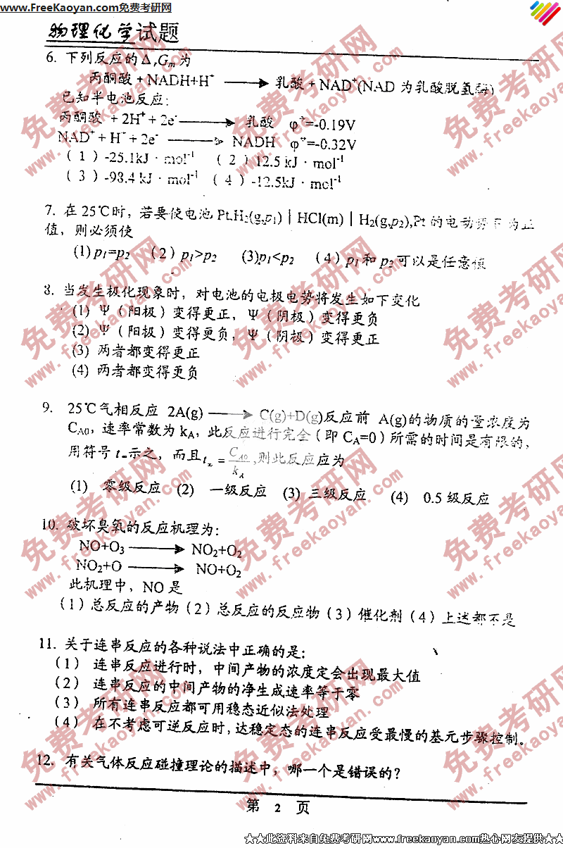 专业课考研经验 本站小编 FreeKaoyan 2018-01-23中国药科大学2003年考研真题-物理化学
