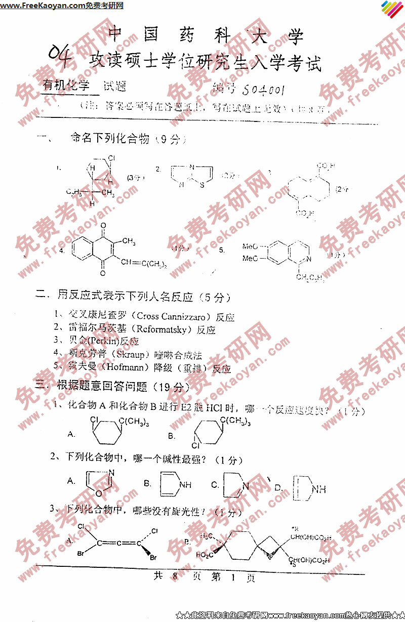 专业课考研经验 本站小编 FreeKaoyan 2018-01-23中国药科大学2003年考研真题-有机化学