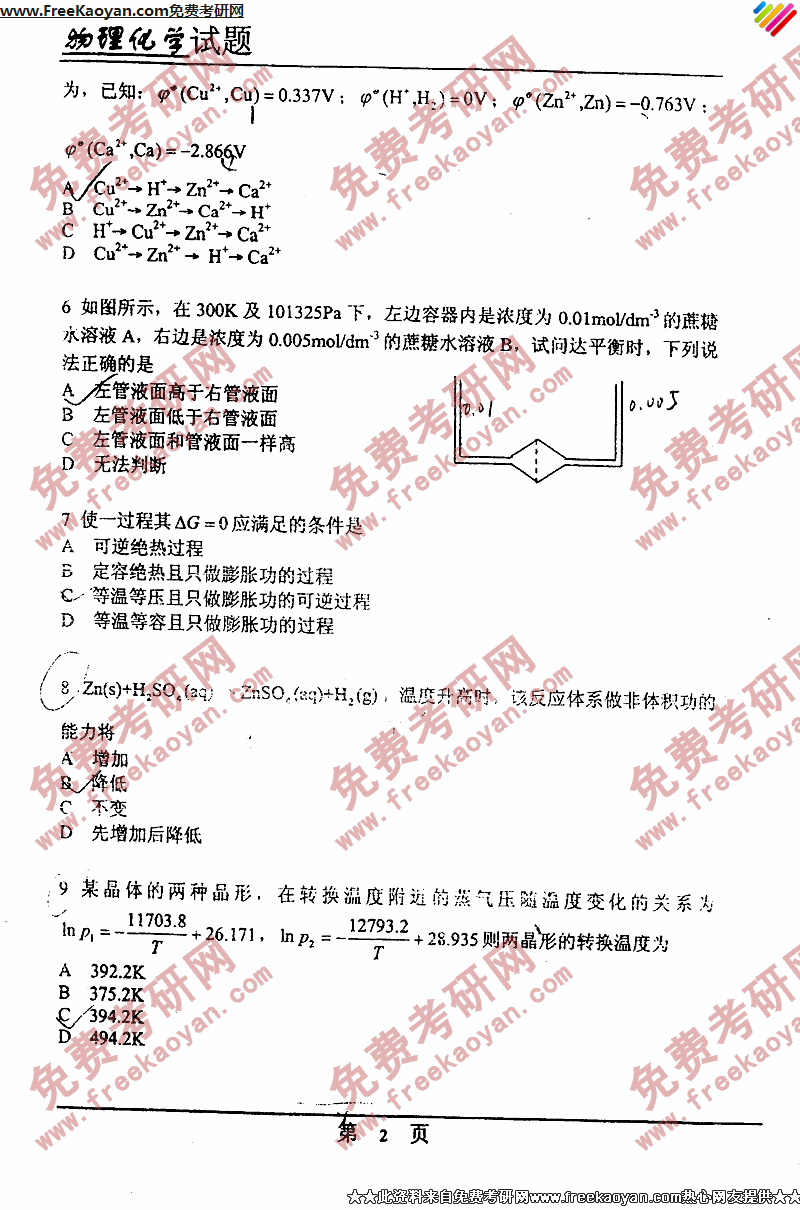 专业课考研经验 本站小编 FreeKaoyan 2018-01-23中国药科大学2003年考研真题-物理化学