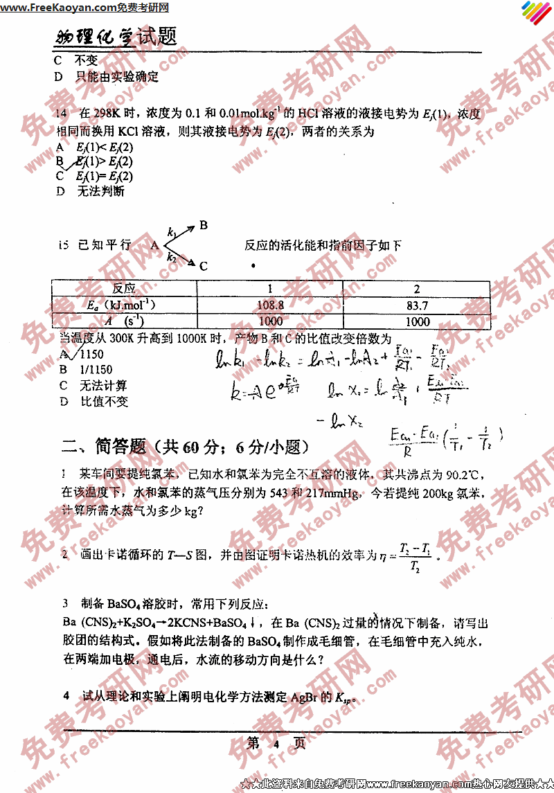 专业课考研经验 本站小编 FreeKaoyan 2018-01-23中国药科大学2004年考研真题-物理化学