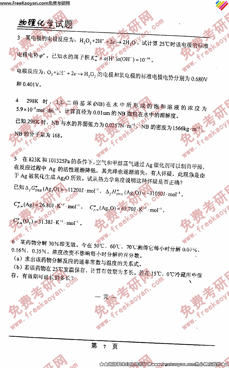 专业课考研经验 本站小编 FreeKaoyan 2018-01-23中国药科大学2003年考研真题-物理化学