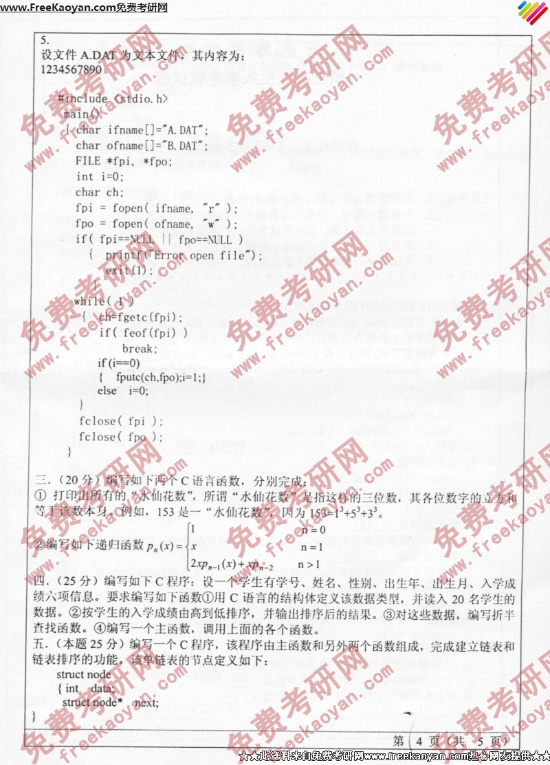 山东师范大学2005年考研真题-C语言程序设计(4)