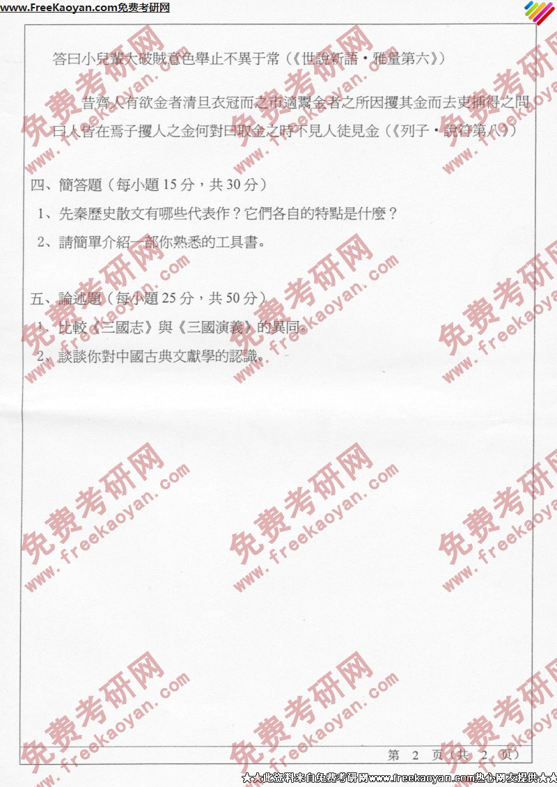 简答1、小说的特点2、为什么说文学是一种更加自由更富创造性的活动?3、为什么在文学接受中需要填空和对话?论述1、文学批评的作用是什么?2、谈谈你对“文学是一种语言艺术”这句话的看法。写作:请根据下列文章写一篇文学评论,字数不少于1500字.文章是孙犁的散文《黄鹂-----病期琐事》 ...专业课考研经验 本站小编 FreeKaoyan 2018-01-23山东师范大学2002年考研真题-现当代文学