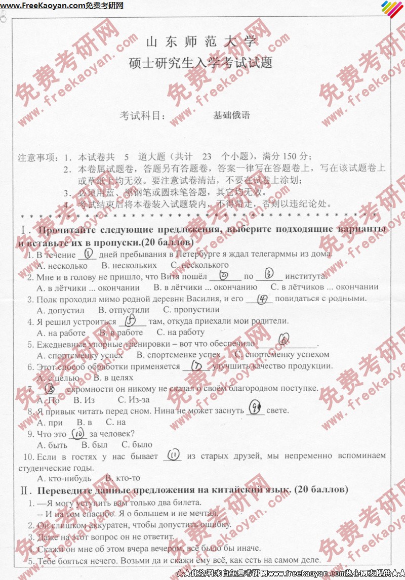 山东师范大学2005年考研真题-基础俄语