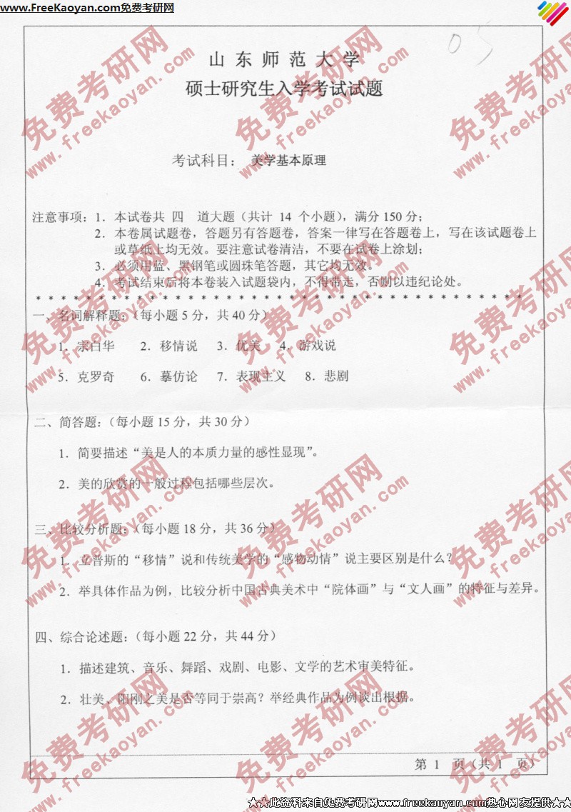 专业课考研经验 本站小编 FreeKaoyan 2018-01-23山东师范大学2005年考研真题-美学