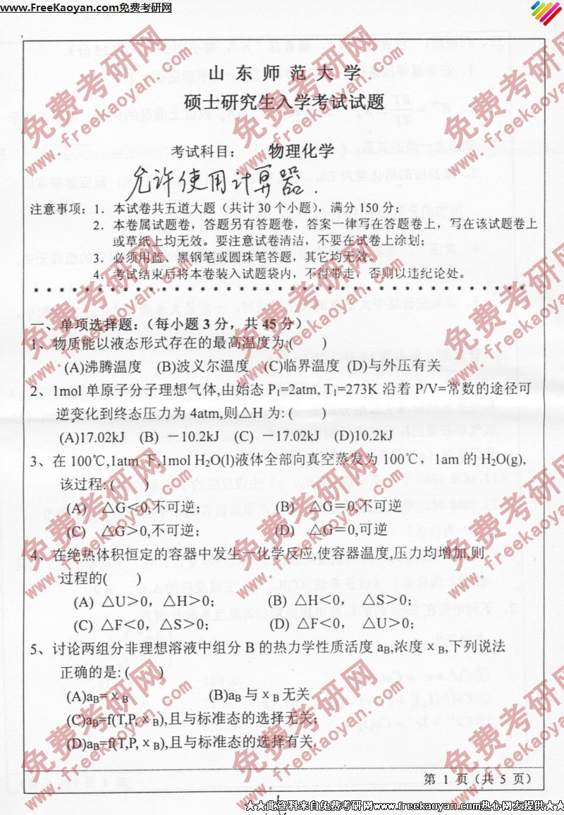 相关话题/山东师范大学 考研真题 物理化学