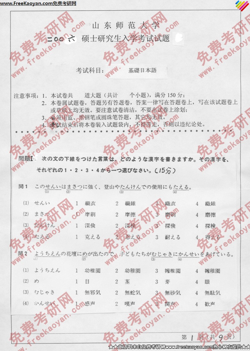 专业课考研经验 本站小编 FreeKaoyan 2018-01-23山东师范大学2006年考研真题-二外日语