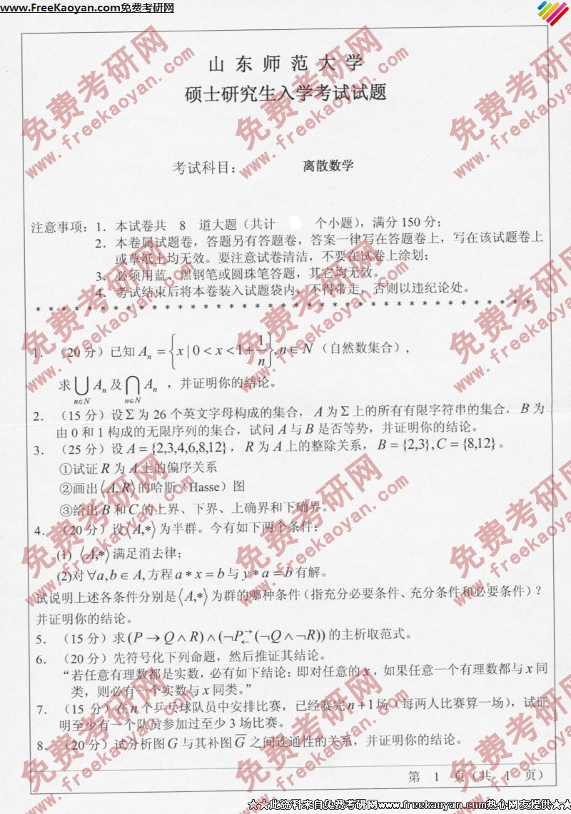 山东师范大学2006年考研真题-离散数学