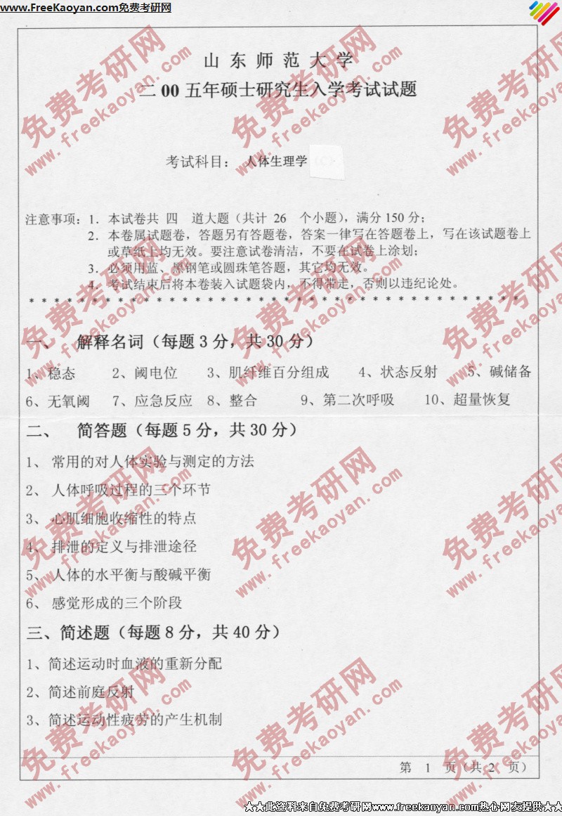 相关话题/考研真题 山东师范大学 生理学 人体