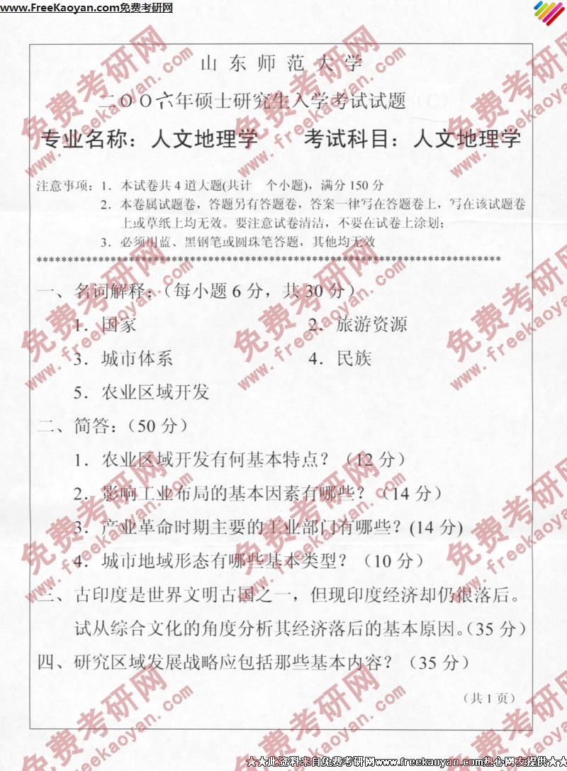 专业课考研经验 本站小编 FreeKaoyan 2018-01-23山东师范大学2006年考研真题-经济地理