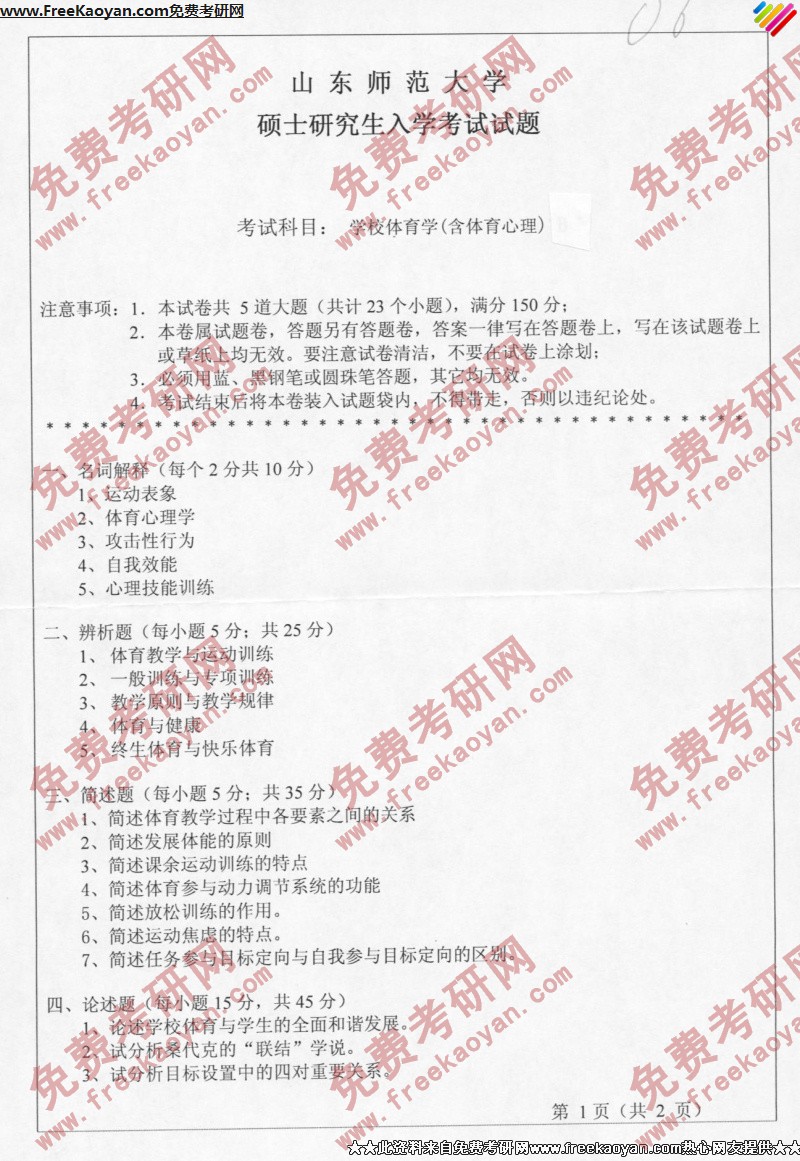 山东师范大学2006年考研真题-学校体育学(含体育心理)