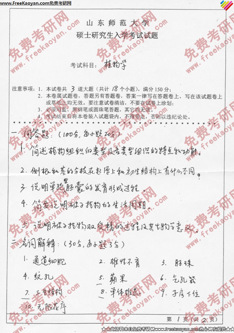 山东师范大学2006年考研真题-植物学